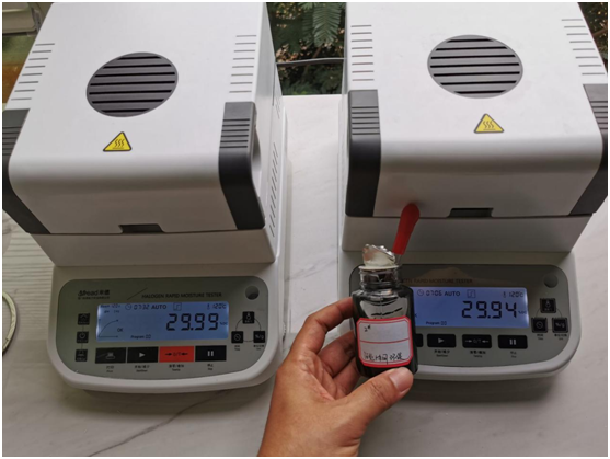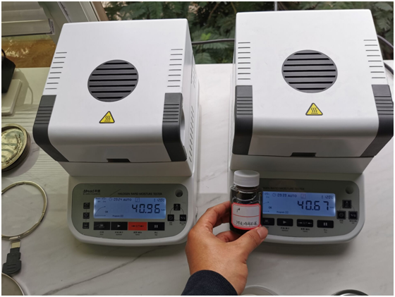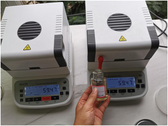 測試目的:聚天冬氨酸是一種氨基酸聚合物,天然存在于蝸牛和軟體動物殼內(nèi),聚天冬氨酸是生物降解性好的、環(huán)境友好型化學(xué)品。聚天冬氨酸用途廣泛。在水處理、醫(yī)藥、農(nóng)業(yè)、日化等領(lǐng)域都能找到它的用途。聚天冬氨酸作為一種新型綠色水處理劑,應(yīng)用于工業(yè)循環(huán)冷卻水處理領(lǐng)域;聚天冬氨酸本身不是肥料,但它可以作肥料增效劑;聚天冬氨酸同時具有分散作用并可有效防止金屬設(shè)備的腐蝕等等。但是合格的聚天冬氨酸溶液固含量應(yīng)在40%以上,我們將通過兩臺固含量測試儀同時測試對比,驗證三瓶聚天冬氨酸試劑中的可溶固體含量。