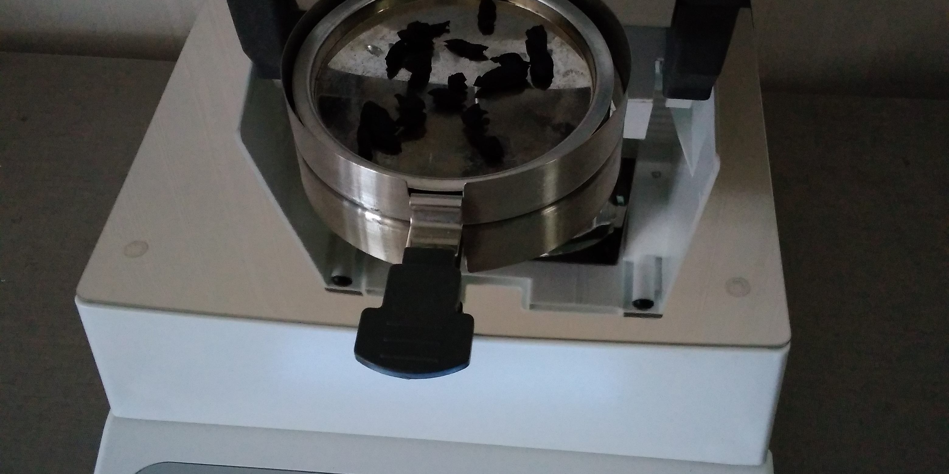 測試話梅干碎:為了使測試過程中話梅干水分儀將話梅干烘干烘透,我們將話梅干用剪刀剪成碎片,攤成分散狀,以便溫度能滲透進(jìn)去。取3克左右話梅干碎均勻鋪撒在不銹鋼托盤中,用鑷子將話梅干碎平鋪均勻,為使話梅干水分完全烘干并且不變焦,我們將溫度設(shè)置在160℃,按“START”鍵開始測試,25分04秒后檢測結(jié)束,檢測數(shù)據(jù)顯示58.44%;