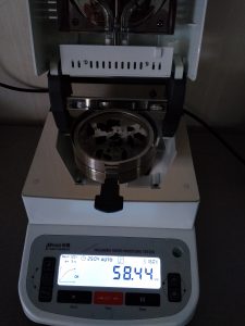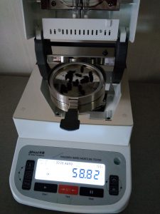 為了得到更精確穩(wěn)定的數(shù)據(jù)結梅,在進行第二次測試過程前先等待話梅干水分儀降溫,待儀器本身溫度降至40度以下時,同樣取3克話梅干碎于不銹鋼托盤中,將話梅干碎平鋪均勻,這次我們把溫度設定在160℃,按“START”鍵開始測試,30分08秒后檢測結束,檢測數(shù)據(jù)顯示58.82%;